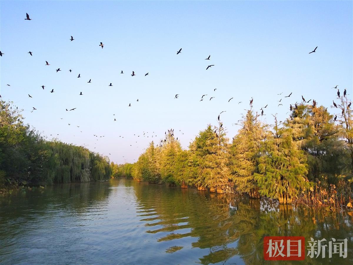 11月5日,一大群普通鸬鹚出现在孝感朱湖国家湿地公园。油亮透黑的个体,与红叶绿林相映生辉,构成一幅精妙绝伦的朱湖湿地秋意图。
