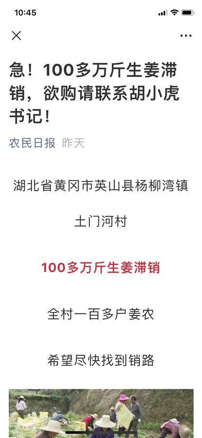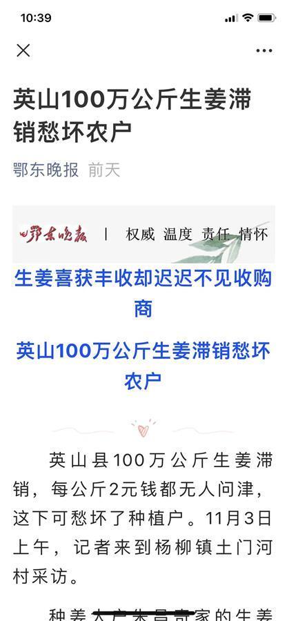 3日,极目新闻以《两块钱一公斤都没人要,英山县100万公斤生姜滞销》为题,报道了湖北省英山县大量生姜卖不出去的消息,报道收到强烈反响,连日来,多家媒体转载并做后续报道,多位热心人士伸出援手,或向当地生姜种植户购买或提宝贵建议,多家平台竞相联系对接。