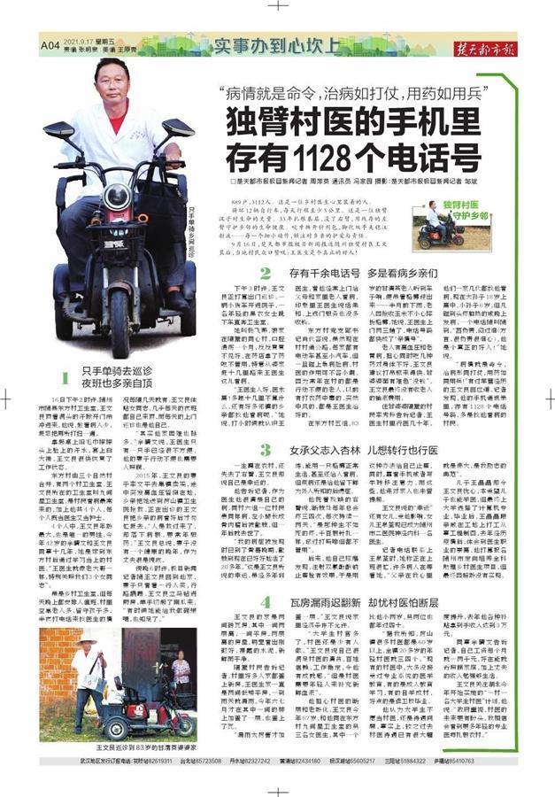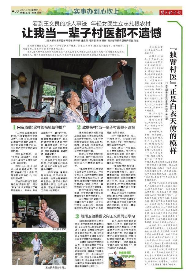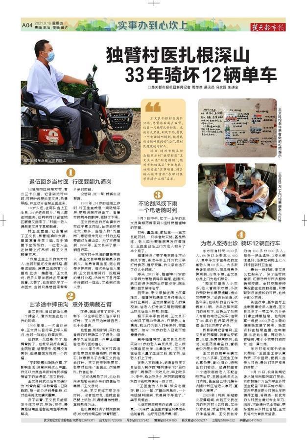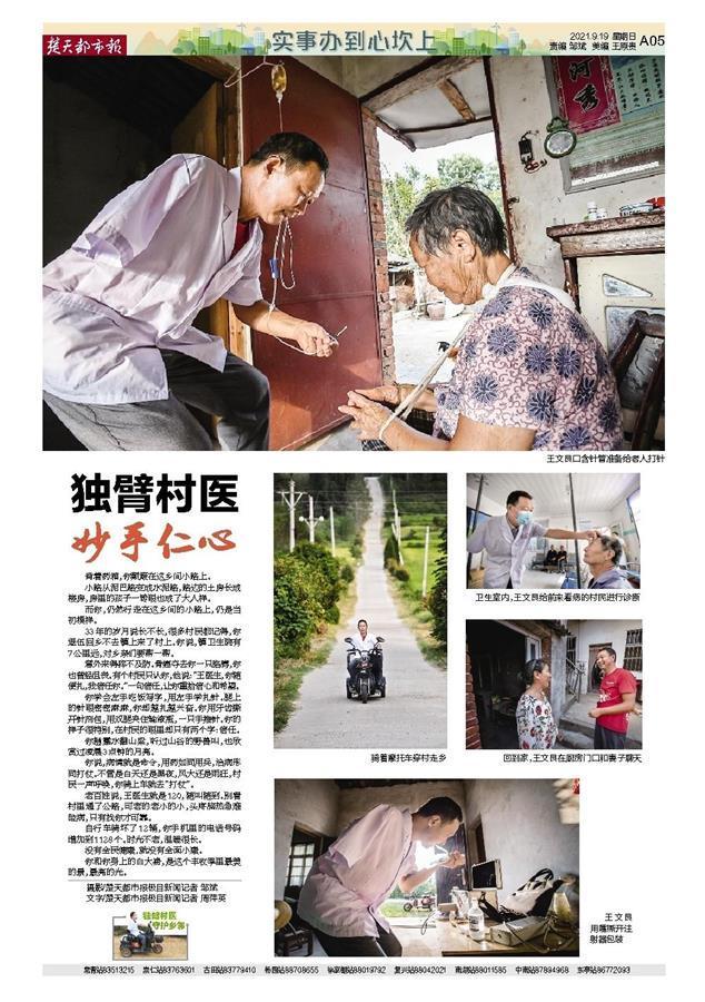 9月初,我驱车近200公里从襄阳赶到随县,来到王医生所在的东方村。有一段路不好走,车子底盘被刮得咚咚响。我们全程见证了王医生的一天,于9月16日推出第一个整版报道。