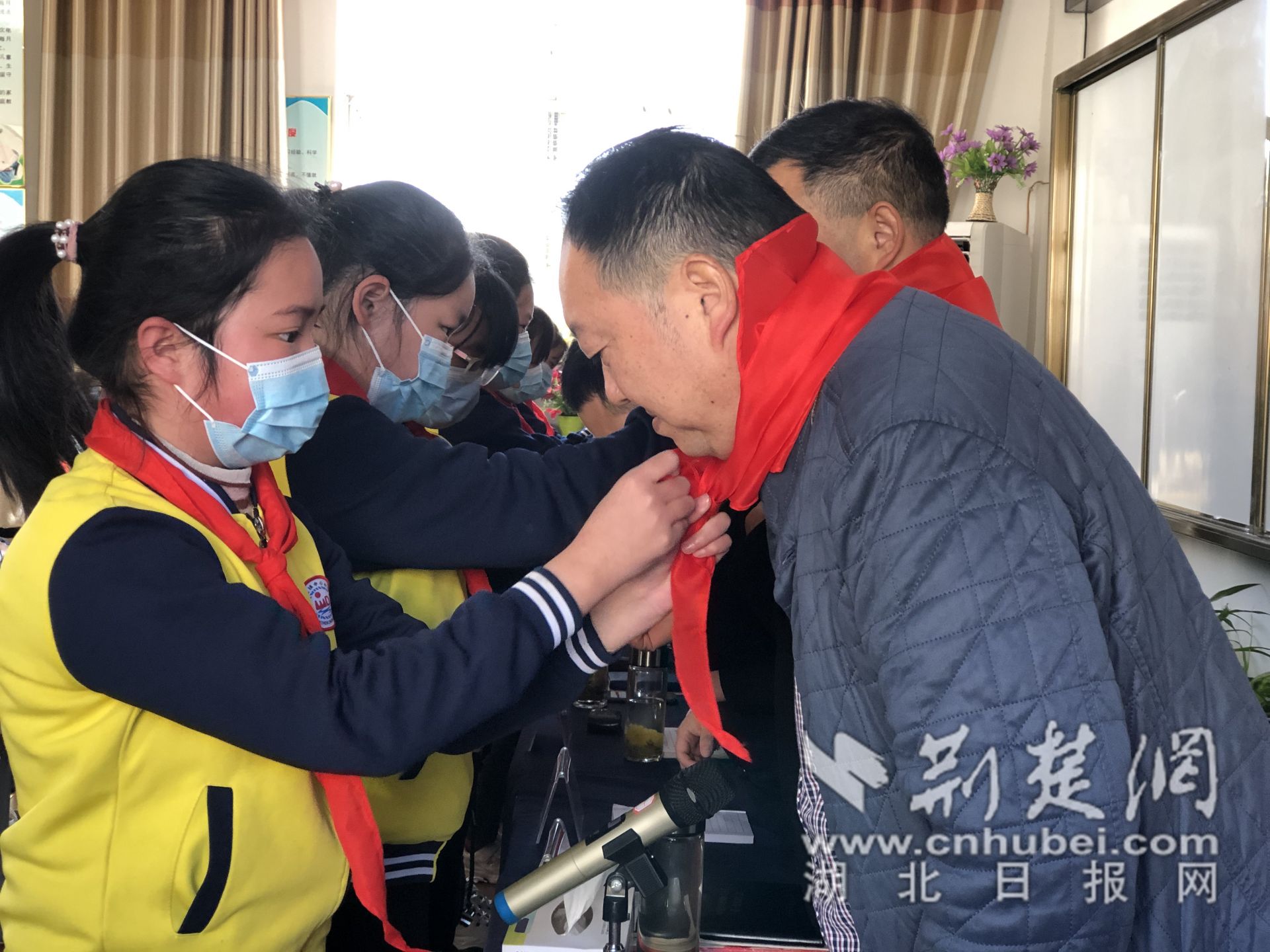 学生代表为参与活动人员系红领巾。通讯员 陈文娣 摄