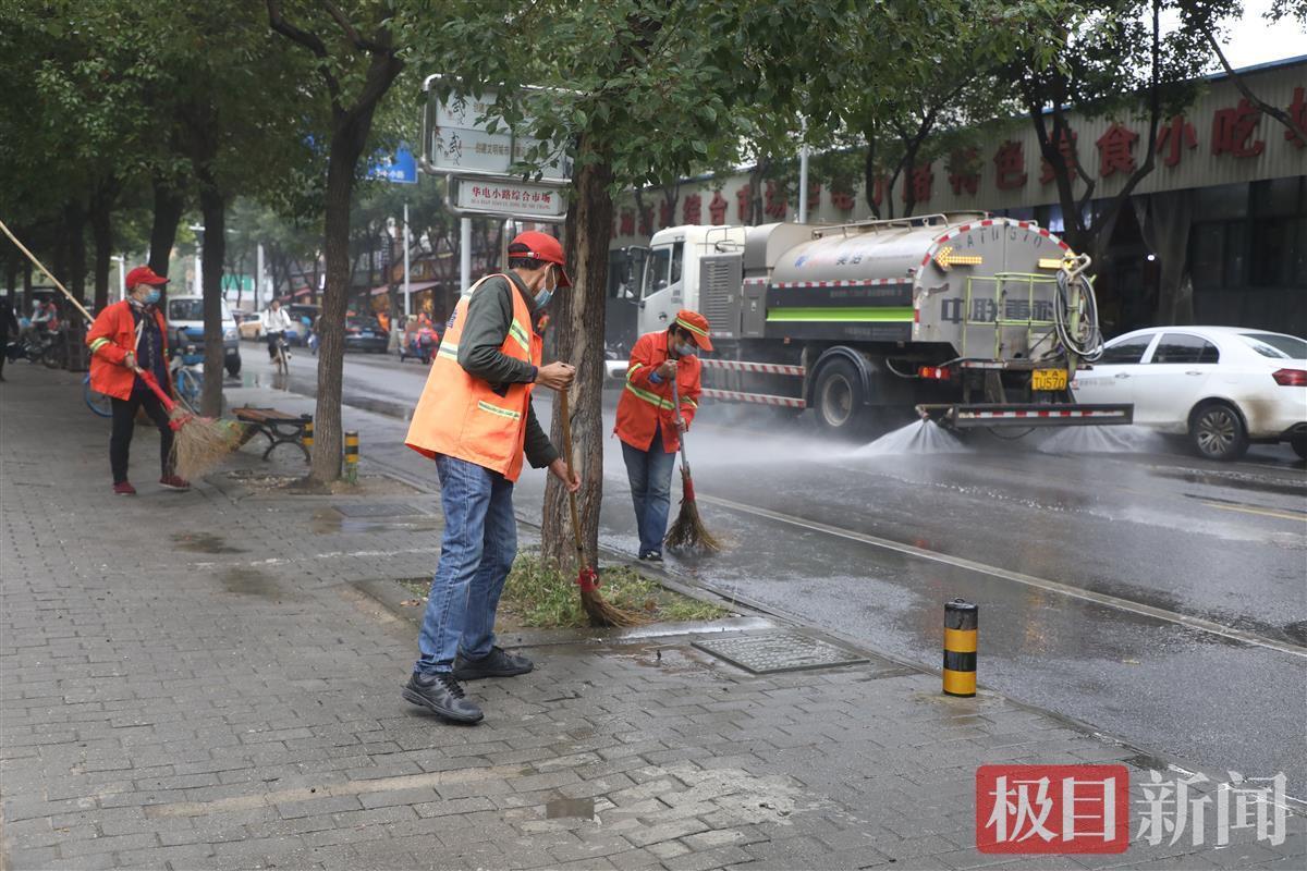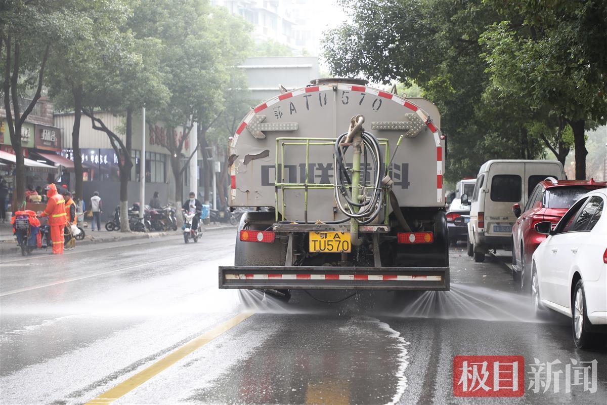 极目新闻记者看到,在华电小路及铁机路上,大型吸扫车在道路上来回吸扫,所经之处,干净整洁,见潮不见水。人行道上,环卫工利用小型高压冲洗车进行冲洗,不一会儿就干干净净。还有一些环卫工对道路沿线的座椅等城市家具进行擦抹,方便市民休息。