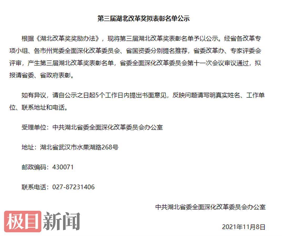 11月8日,湖北省委改革办公布第三届湖北改革奖拟表彰名单,并向社会公示。