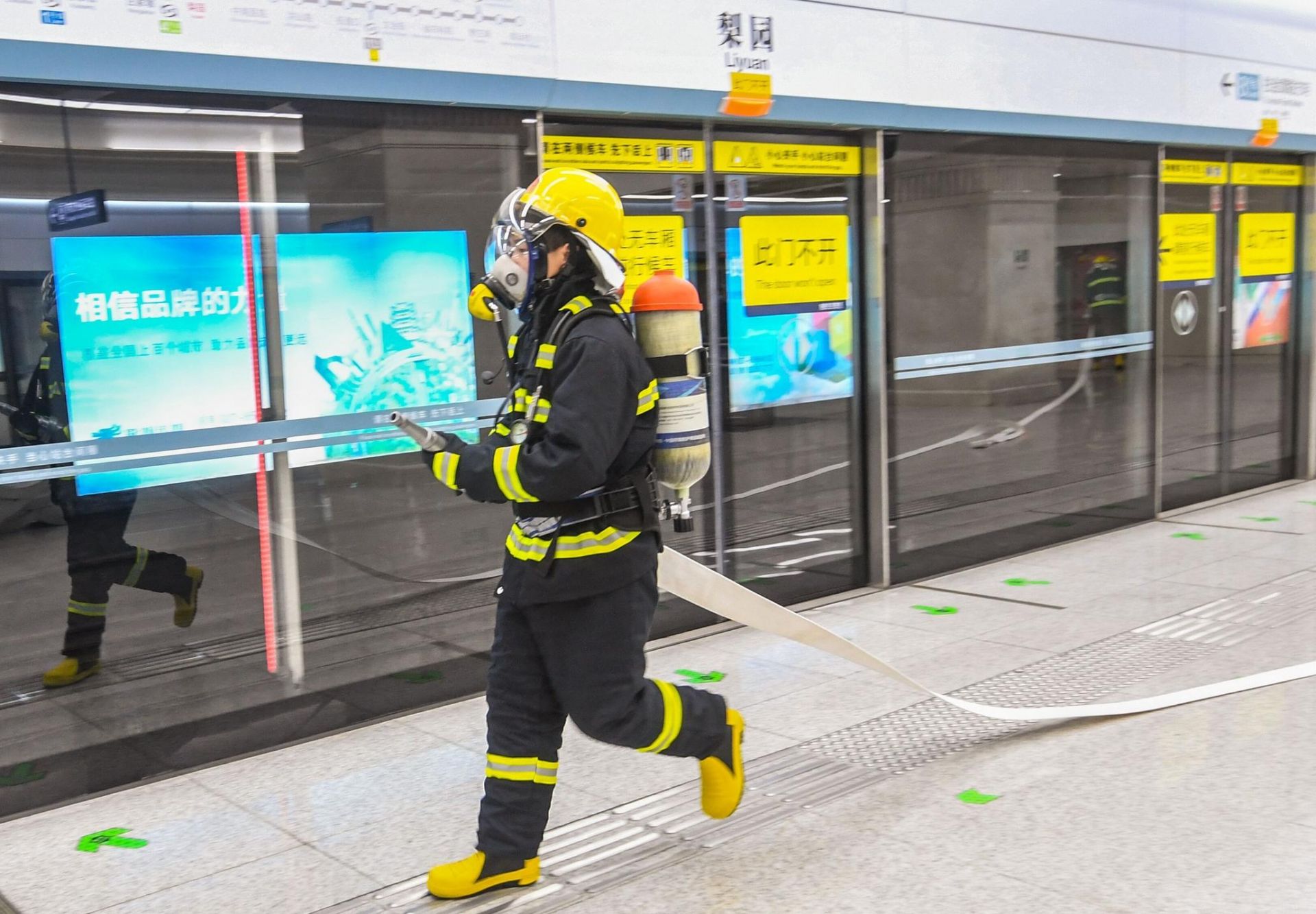 地铁站内微型消防(救援)站,内有灭火防护服、正压式空气呼吸器、消防水带水枪、安全绳、强光手电等物品20余种,有助于在发生火情时实现救早、灭小、处置及时。