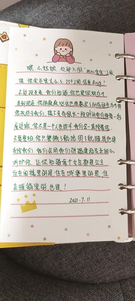 许女士至今记得,今年中秋节当天,她和丈夫去医院看望童童,虽然不能来到童童床边,但何海燕把日记本拿出来时,她还是充满了惊喜与感激。为了表达思念,许女士也在日记本上写下了对女儿的祝福。经过消毒后,这个充满爱意的日记本重新回到了童童身边。