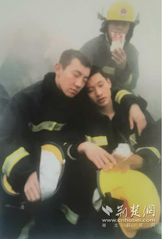 图为孙络络(前排右)和战友扑灭火灾后休息
