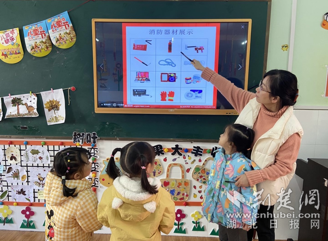 老师教孩子认识消防器材。通讯员 李蓉 摄