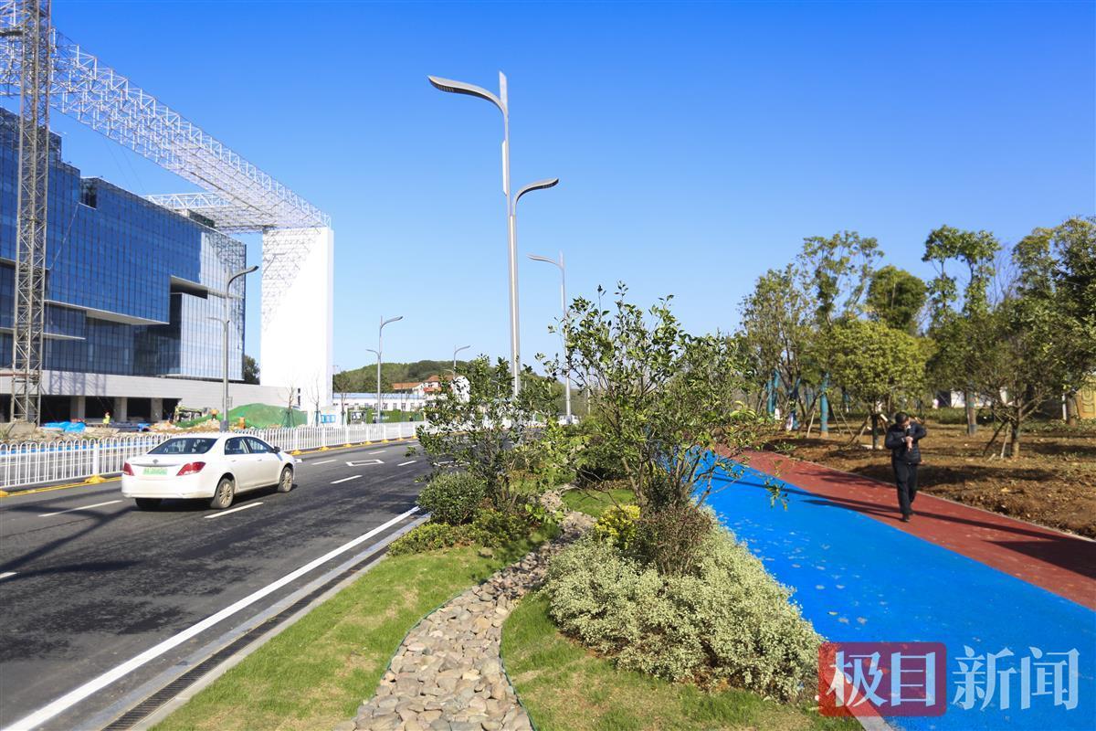 路灯为新叶型智慧路灯、多杆合一。此外,东侧全线人行道采用“中国红”、非机动车道采用“光谷蓝”彩色沥青铺装;西侧人行道采用大理石铺装,非机动车道采用“光谷蓝”彩色沥青,与生态大走廊绿道“中国红、光谷蓝”相得益彰。