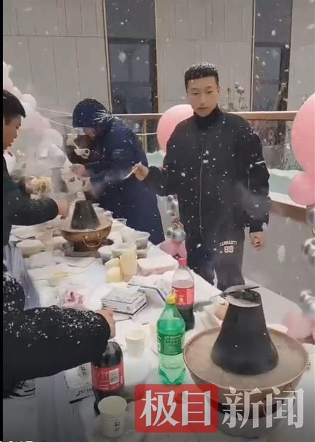 11月8日,左先生发布视频并配文称,沈阳第一场雪,瑞雪兆丰年,铜火锅安排。视频中,不少人穿着羽绒服,并戴着帽子,空中飘起了雪花。一处楼顶平台上,桌子上摆放着火锅以及各种食材,旁边还扎有很多气球,一群人在雪中吃起了火锅。地面上已经有不少积雪,也有人没戴帽子,头上沾有雪花。