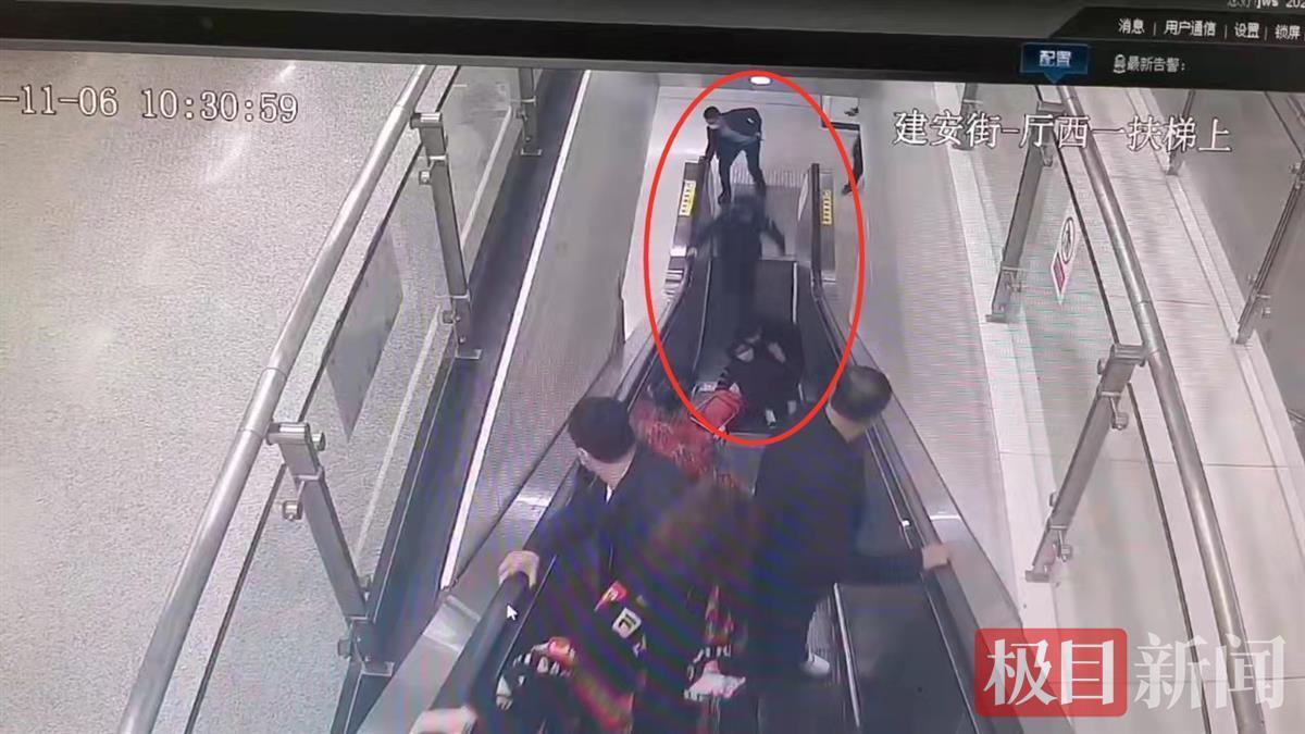 11月6日上午10时32分,武汉地铁7号线民警徐楠在建安街站台巡逻时,突然听到扶梯处传来一声惊呼。徐楠立马循着呼救声飞奔到扶梯处,发现一位婆婆在快速运行的扶梯上摔倒。一名正要走上扶梯的女乘客看到婆婆摔倒后,立即跑上扶梯,想要将婆婆扶起,但由于力量薄弱,无法立刻扶起。