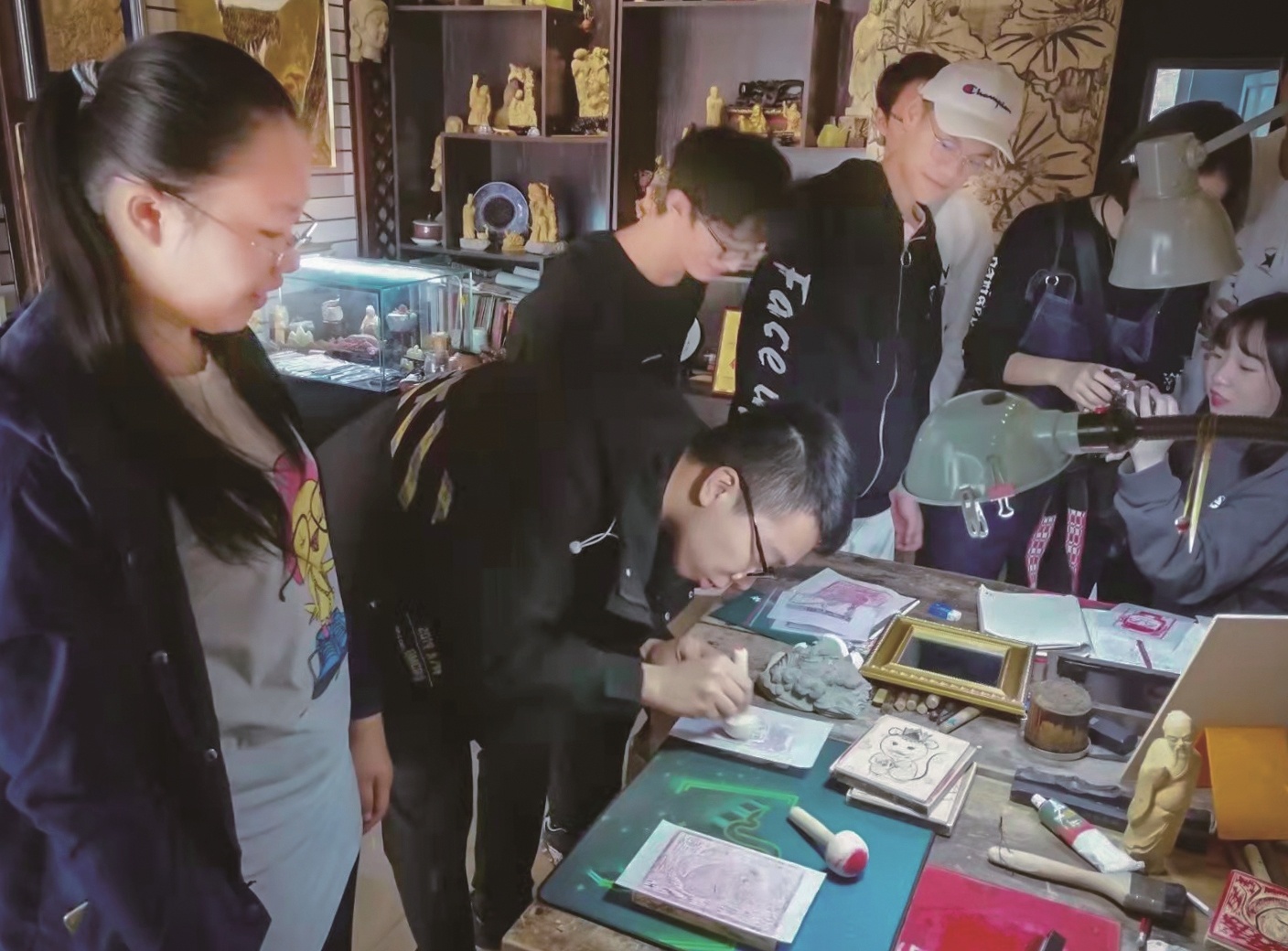 大学生来工作室体验木刻版画的制作过程
