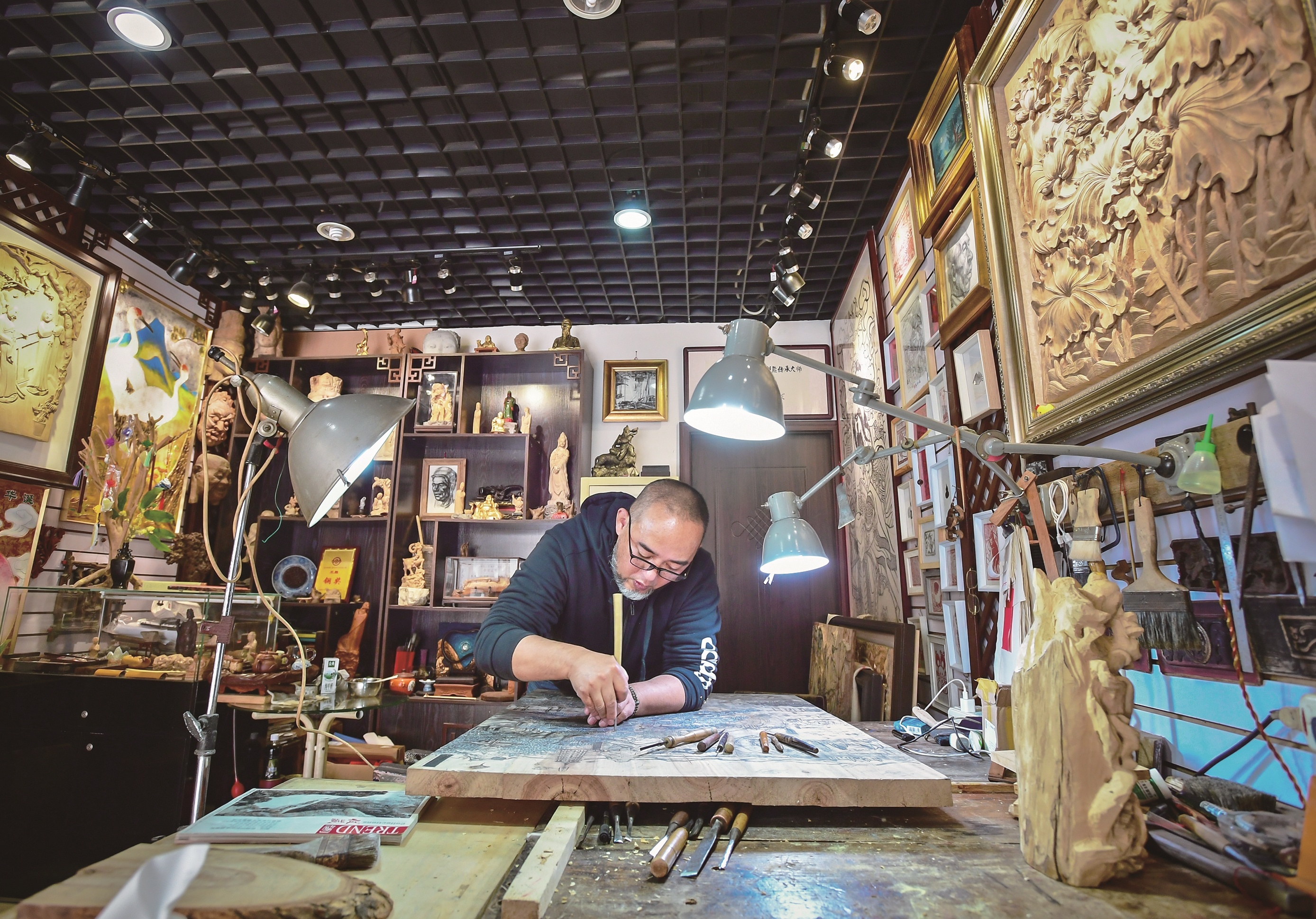 没有客人时,身穿牛仔裤、戴着老花镜、胡子半白的朱明,会一头扎进自己的雕刻世界,和木头、众多刻刀为伴,静静地雕琢时光,雕琢传统。