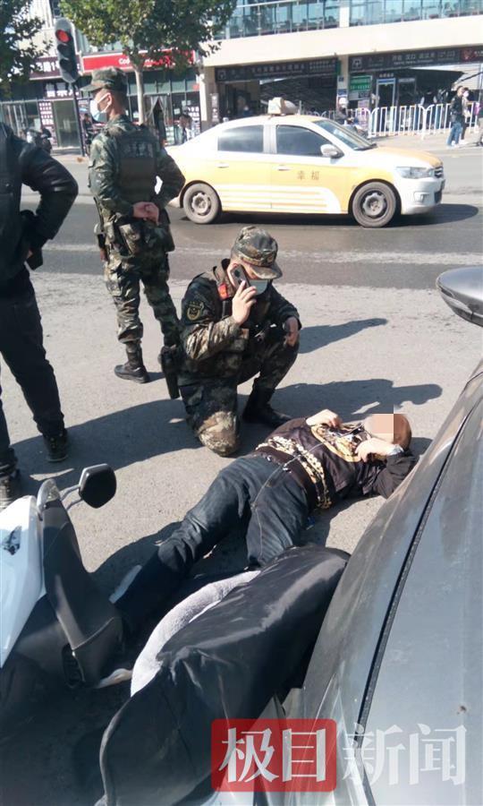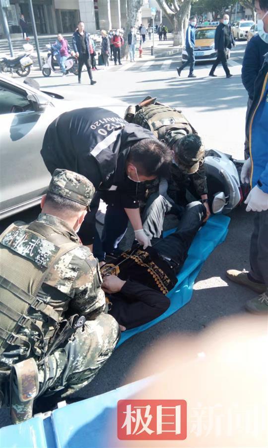 11月10日上午11时20分许,武警武汉支队执勤6中队照例在武昌街面巡逻,巡逻车行至临江大道与中华路交会处时,小组长罗涛发现前方路口停着一辆小轿车,小轿车一侧的地面上,倒着一辆电动自行车,一名男子倒在地上。这是一个丁字路口,不时有车辆从旁边快速经过。