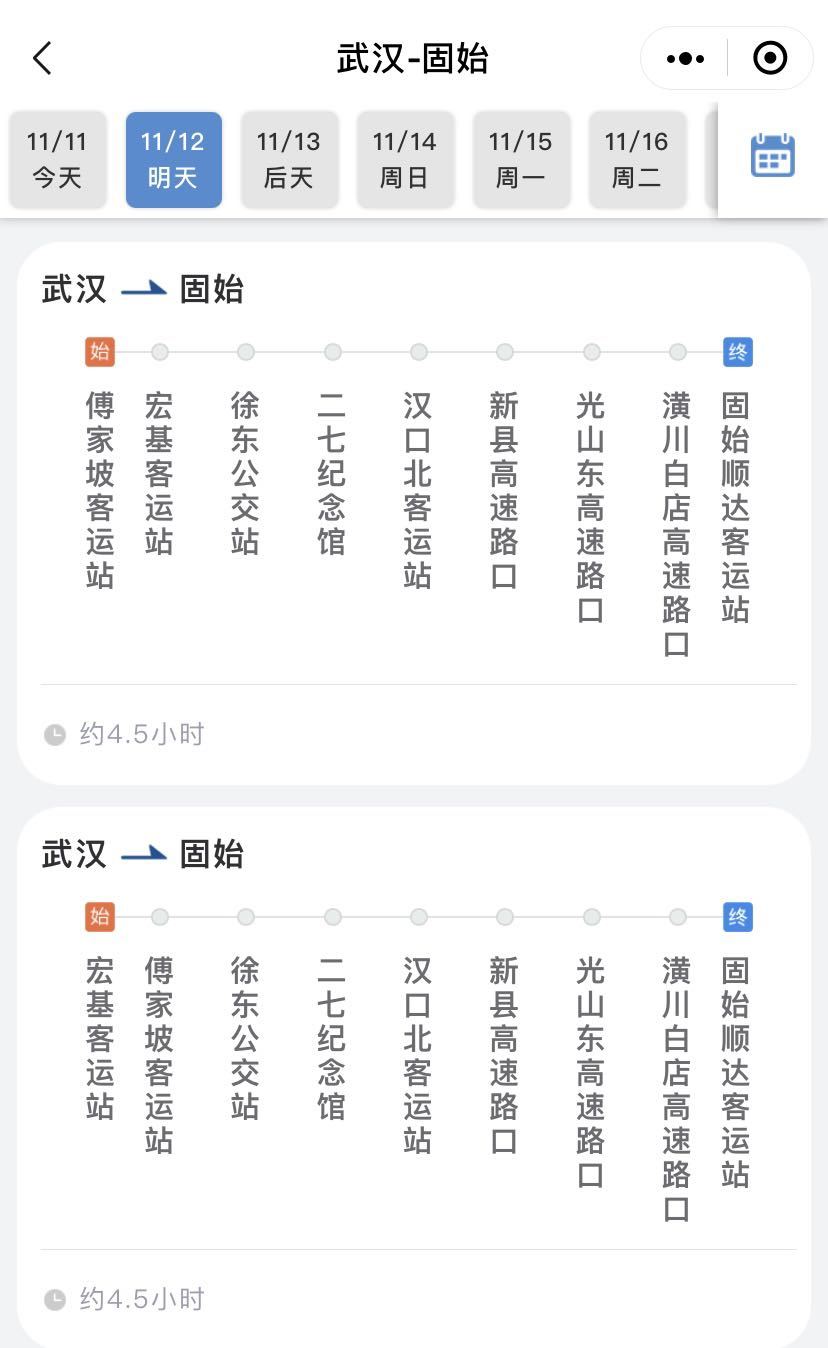 长江日报大武汉客户端11月11日讯(记者王谦 通讯员李媛媛)为给旅客提供一站式乘车服务,发挥道路运输“门到门”的优势,省客集团首条跨省定制客运班线武汉-固始将于11月12日正式开通营运。该班线全程318公里,运行时间4.5小时,票价127元,每日发送两班车:上午8:00,下午13:40。武汉-固始班线在武汉的乘车点包括:傅家坡客运站、宏基客运站、徐东公交站、二七纪念馆、汉口北客运站。