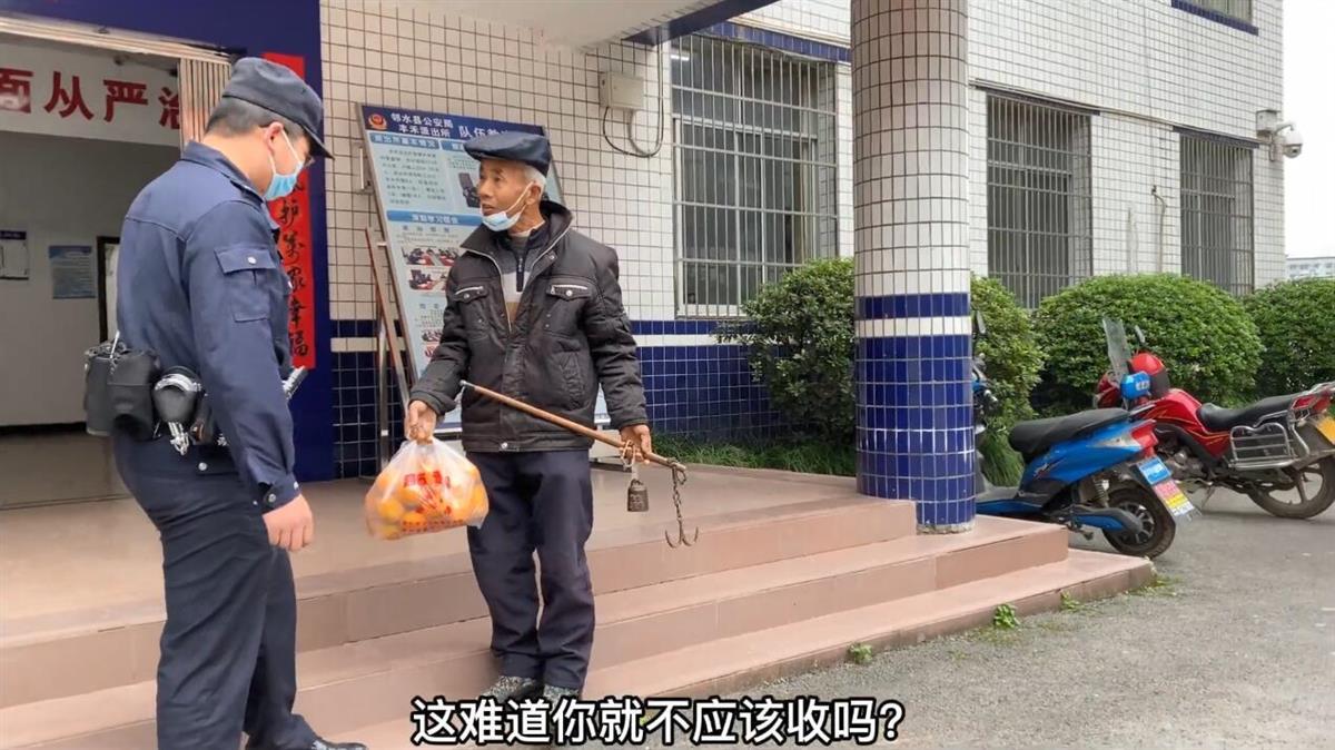 “难道你不应该收吗?你要方我噻?真的方我假的方我?你给我接到(橘子)。”(注:“方我”是当地方言,意为“让我下不来台”)11月9日,四川省邻水县丰禾派出所门口,一位老人一手提着一袋橘子,一手拿着一杆老秤,以命令式的口吻向一位辅警说道。几番推托之下,该辅警笑着收下了老人的橘子。而此前一脸严肃的老人也“画风突变”,笑着对辅警说:“接到我就很高兴,不好意思啊,我这个人嗓门大,谢谢你帮我把秤找到。”