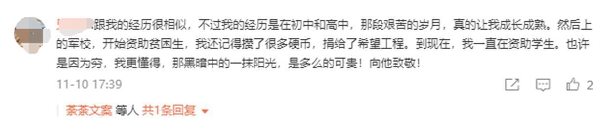 微博上一位网友评论:“跟我的经历很相似,不过我的经历是在初中和高中,那段艰苦的岁月,真的让我成长成熟。我上了军校,开始资助贫困生,我还记得攒了很多硬币,捐给了希望工程。到现在,我一直在资助学生。也许是因为穷,我更懂得,那黑暗中的一抹阳光,是多么的可贵!”