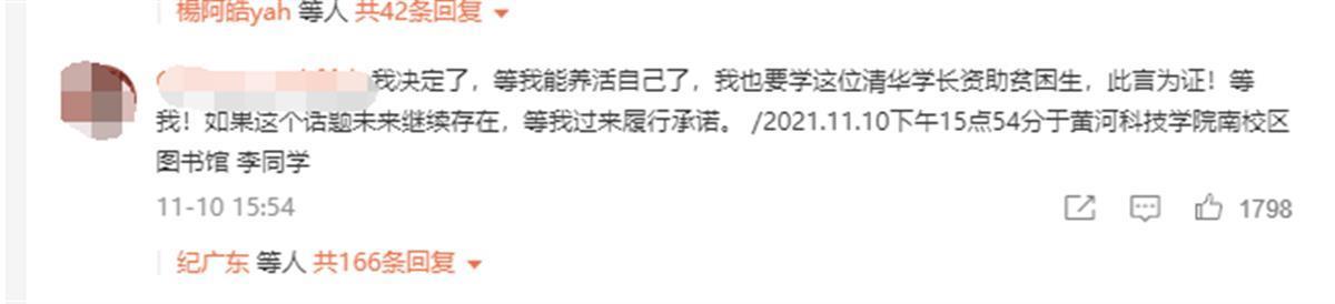 记者在评论区还看到,有不少在校学生深受震撼。黄河科技学院南校区的李同学于11日下午3时54分留言称,“我决定了,等我能养活自己了,我也要学这位清华学长资助贫困生,此言为证!等我!如果这个话题未来继续存在,等我过来履行诺言。”一位名叫子安的网友留言称,自己正处于低谷期,读到这篇文章,感觉自己也没有那么抑郁了,想想自己目前的事,根本不算什么。
