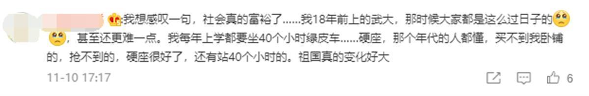 “我18年前上的武大,那时候大家都是这么过日子的,甚至还更难一点。我每年上学都要坐40个小时绿皮车、硬座,站40个小时,不得不感叹一句,祖国真的变化好大。”也有网友回忆起求学时的艰苦岁月。
