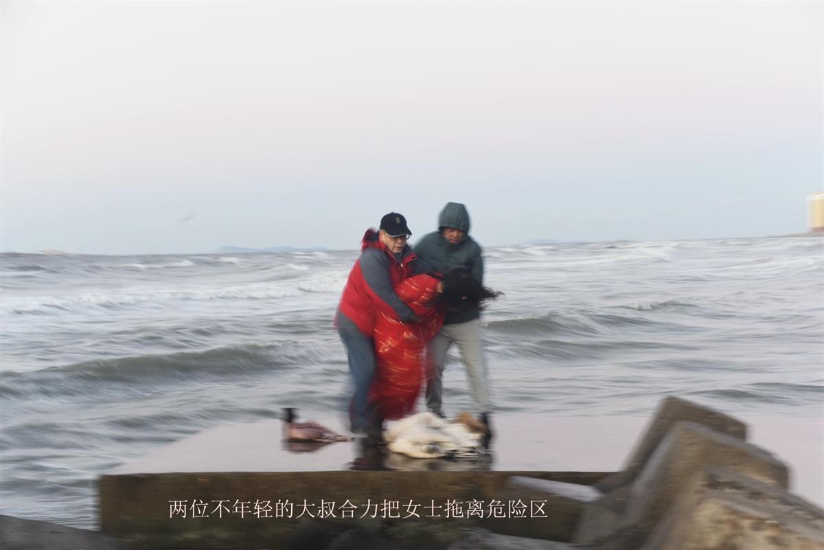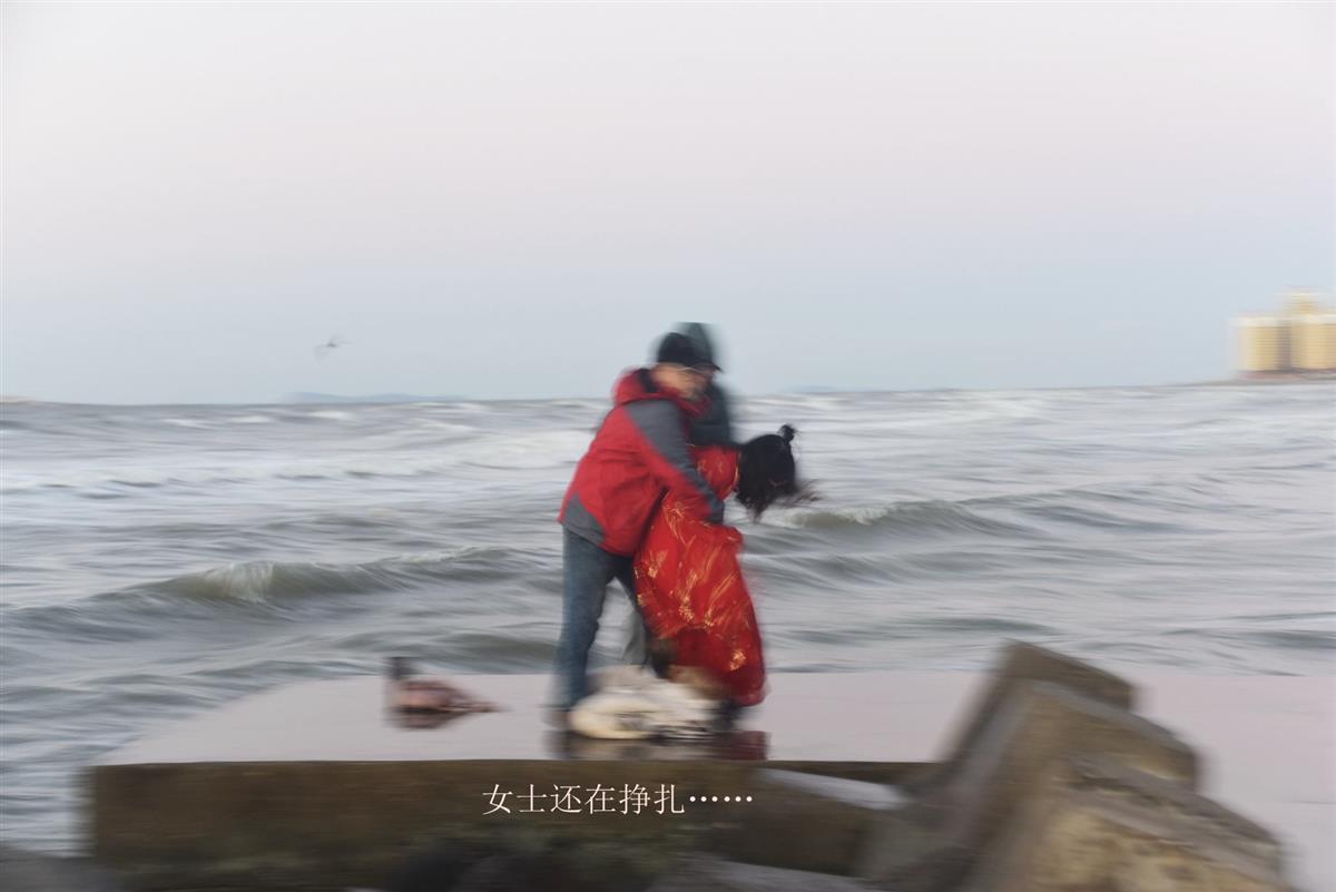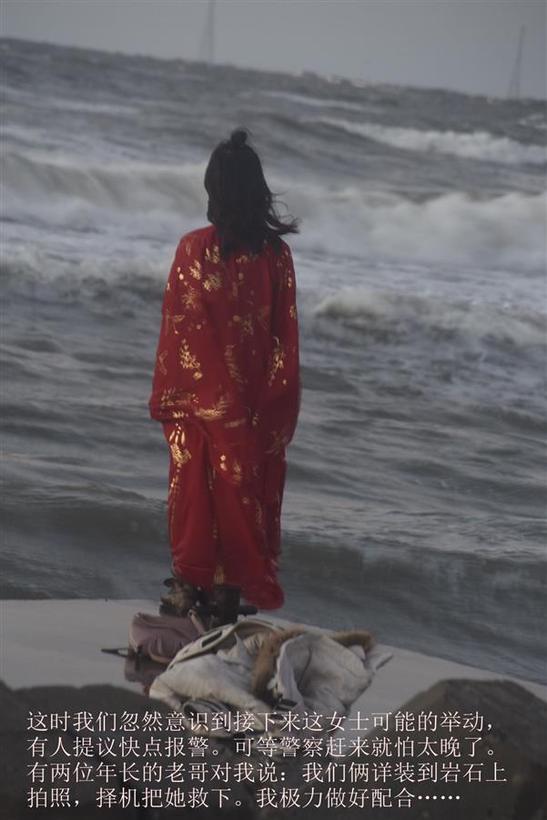“我们拍完日落后,前后大概有20多分钟的时间,发现女孩还在那里站着,一动不动。”赵教授说,不一会,女孩把包扔在了地上,外面穿的羽绒服也脱了扔在地上。“一身红色的纱裙,海水不断拍打在女孩身上,女孩也不躲,这时候我们觉得不对劲了,女孩可能是想轻生。”赵教授说,他和段教授分头行动,他去找附近水性较好的渔民,以备女孩真的跳水可以及时施救,段教授与两位市民以拍照为掩护慢慢靠近轻生女孩,趁女孩不注意,将女孩抱离危险区域。