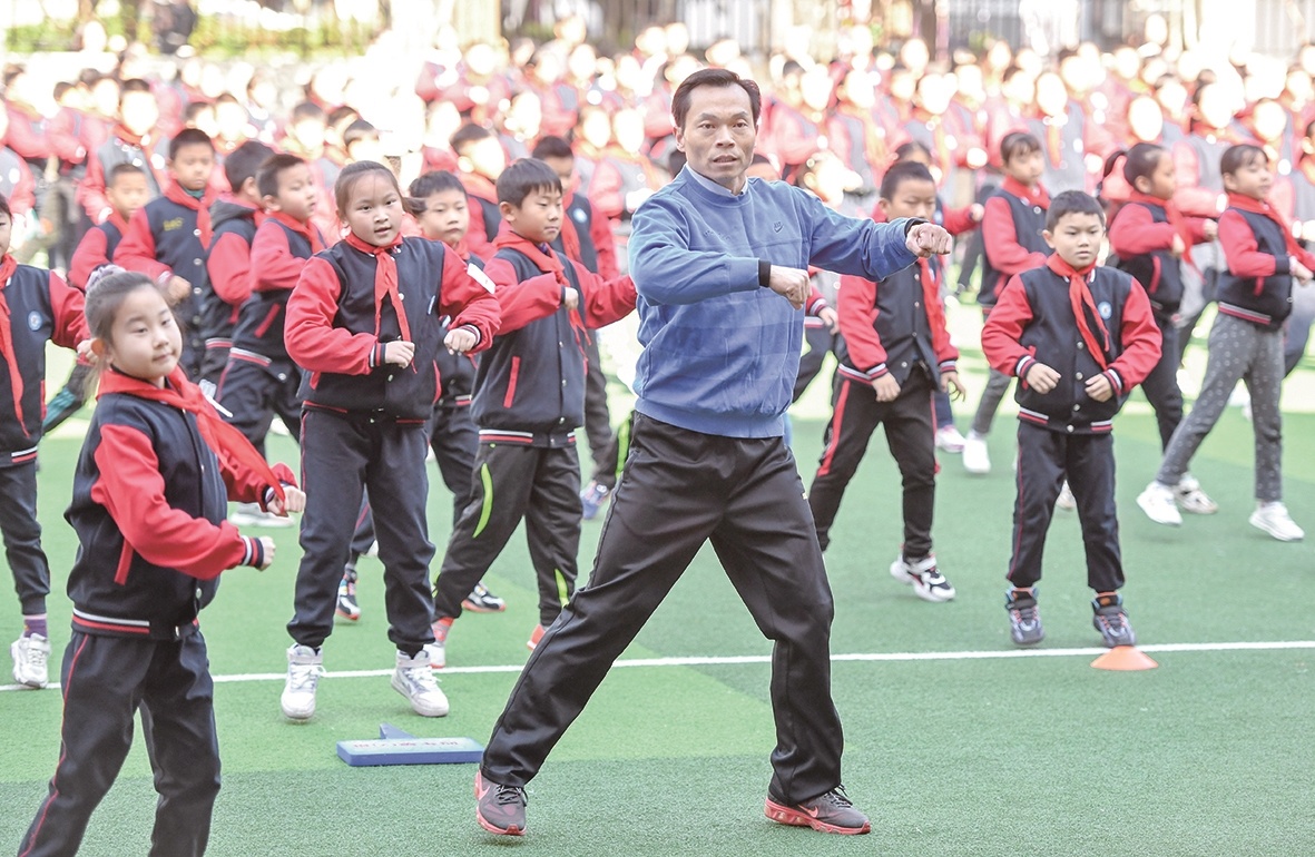 “一个一个梦飞出了天窗,一次一次想穿梭旧时光。”11月11日上午,武汉市江汉区长港路小学的操场上,校长带领千余名师生在大课间跳起了健身操《大梦想家》。伸手、抬腿、弯腰……学生们身着校服,在操场整齐排列开来,随着伴奏播放的音乐,精神抖擞地跳着。