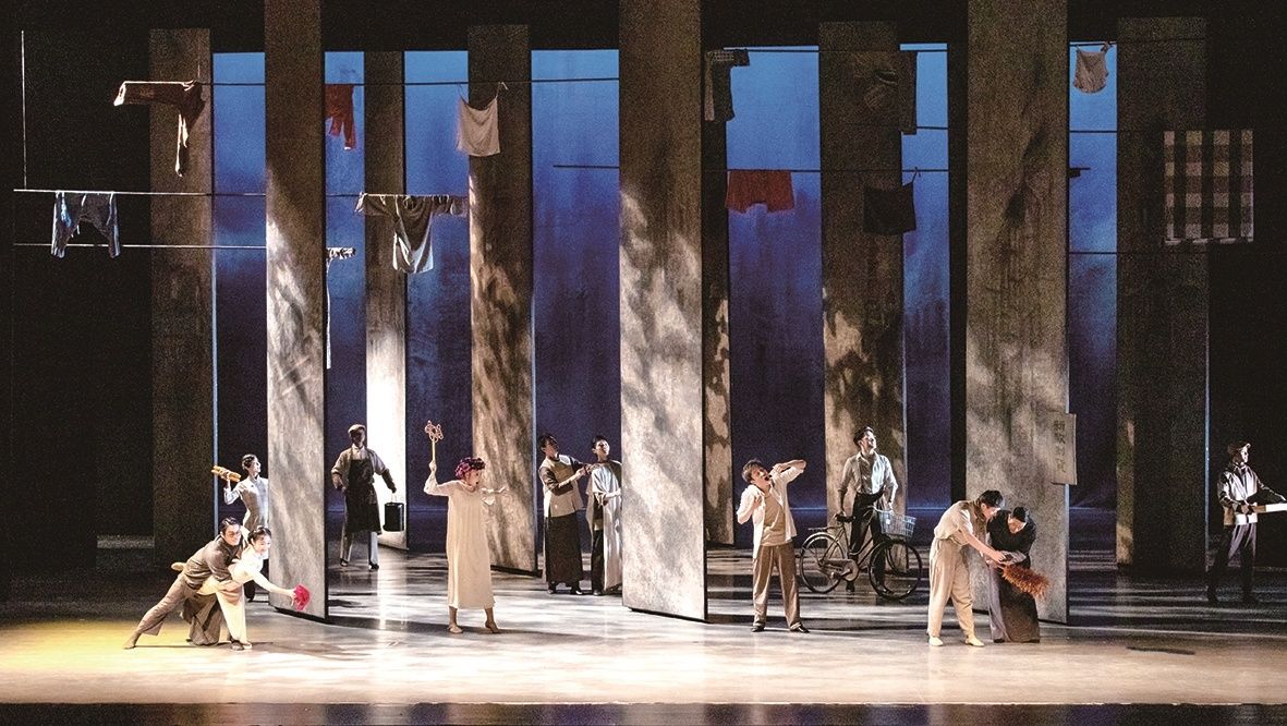 这是一段弄堂里的烟火生活,穿插于紧张的谍战氛围中更显珍贵。舞台上,伴着悠扬的旋律,身着曼妙旗袍的女舞者们手执蒲扇,时而用扇子扇着煤炉,时而扬起蒲扇遮住清晨那突然乍现的一缕光,整齐划一的动作、曼妙的背影和光影营造出晨光袅袅的视效,让观众忍不住拍红了巴掌。