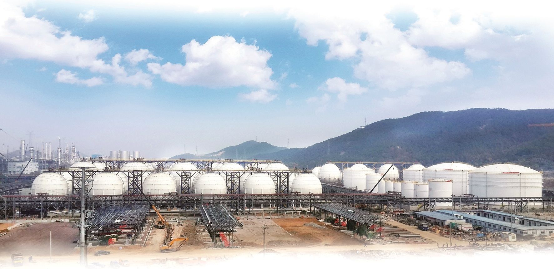 一个个硕大的白色球罐并排排列,未来球罐内将注入天然气,储存、运输后广泛应用于国计民生。