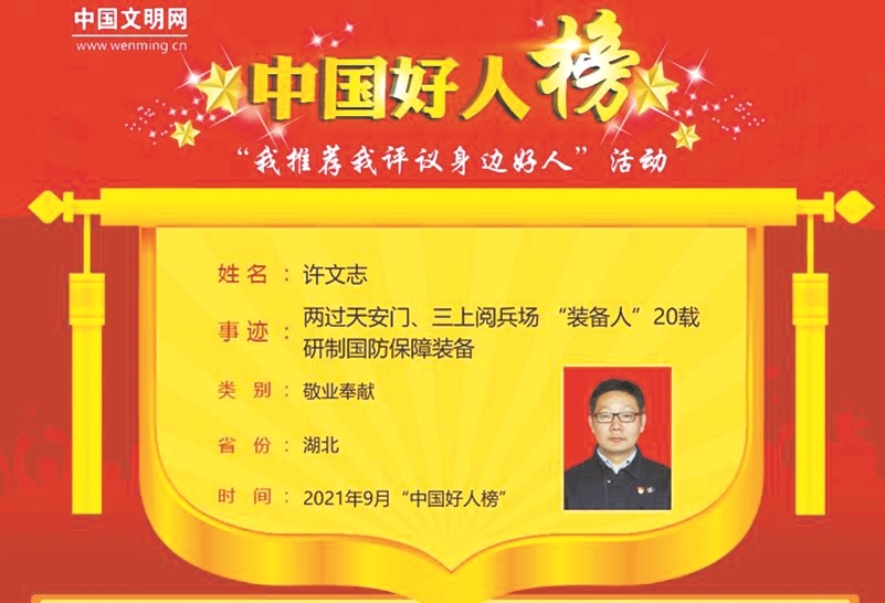 近日,中央文明办发布2021年9月“中国好人榜”,由武昌区推荐的三三O三工厂许文志荣登2021年9月中国好人榜。