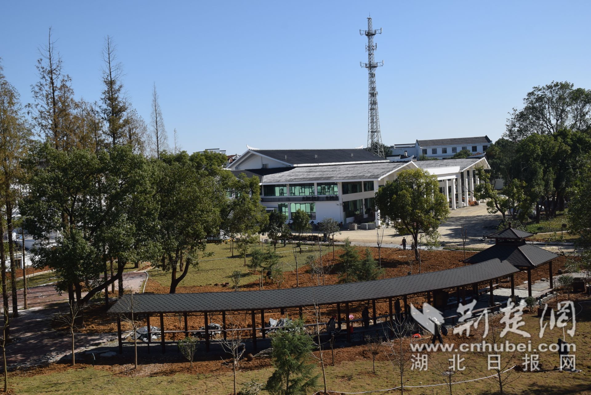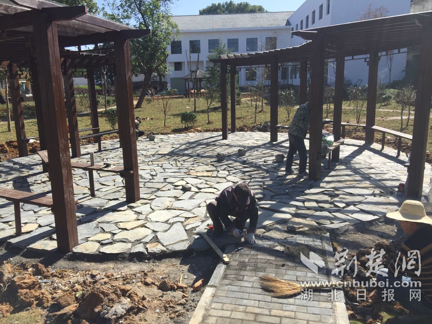 11月12日,应城市汤池镇游客集散中心改造现场机声隆隆,趁着晴好天气,工人师傅们抢抓施工,忙着硬化道路、铺设人行地砖、栽种绿化树苗,一派繁忙建设景象。