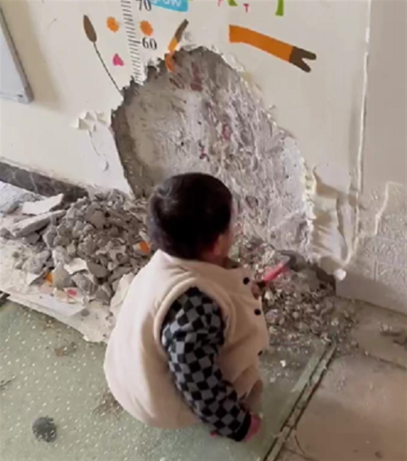 视频显示,一个小男孩蹲在墙边,其左手拿着一个羊角锤,不断敲击墙体。原本完好的客厅墙面,已经是“伤痕累累”,地板上则留下了一堆水泥碎片。