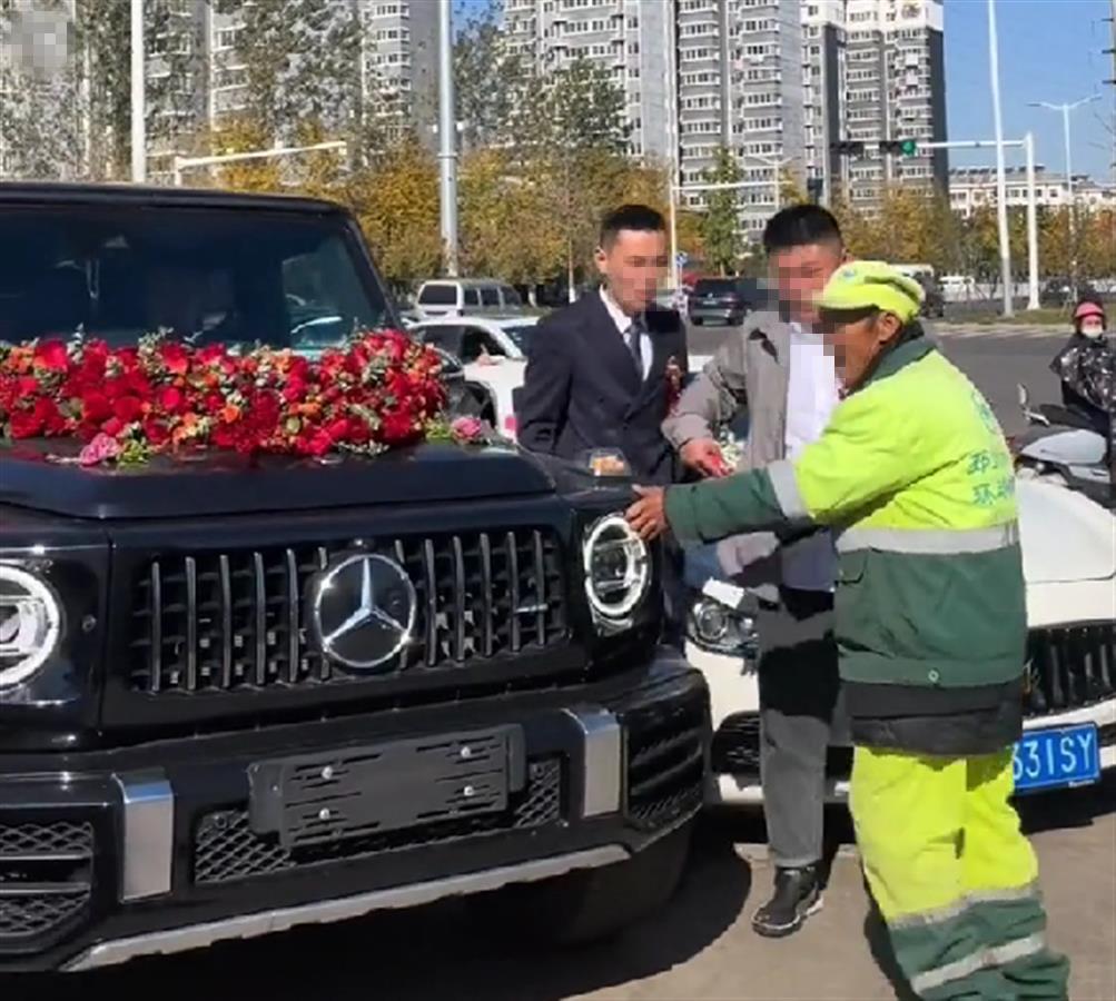 这段视频的标题是“两位环卫工当街拦婚车要‘喜钱’”,不过,视频中并没有现场的对话声。