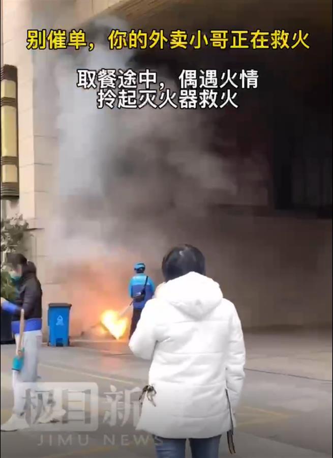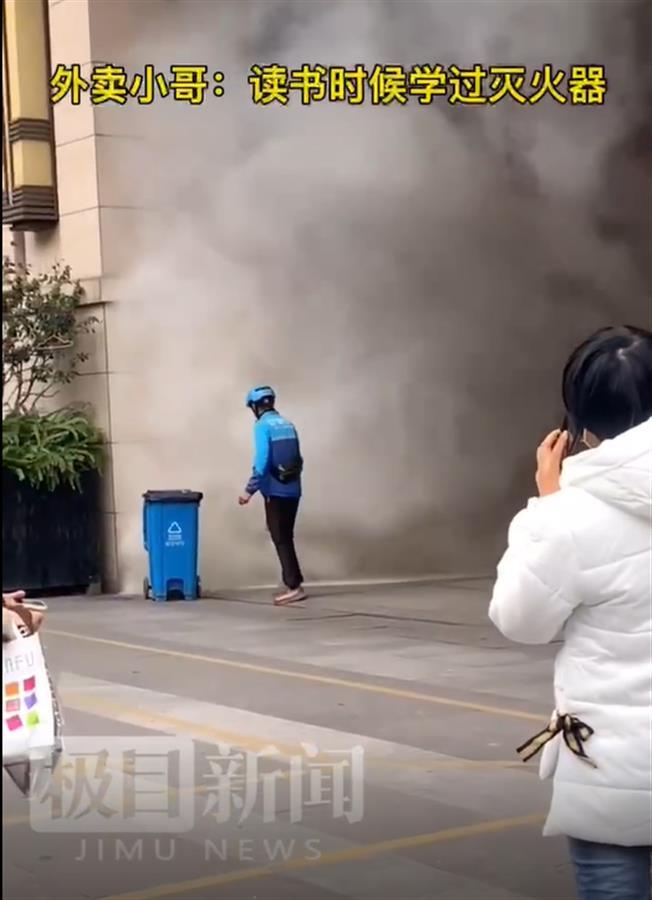 11月12日,极目新闻记者联系上救火的这位外卖小哥成先生,他告诉记者,事发10日中午,他前往重庆九龙坡区一家餐厅取餐时,看到附近的一垃圾桶旁燃起了火,当时有人去附近找灭火器没有找到。于是,他去附近的电梯处找到了灭火器,并很快将火势扑灭。灭火后,他担心复燃,再一次回到垃圾桶旁,使用灭火器喷射着火点。