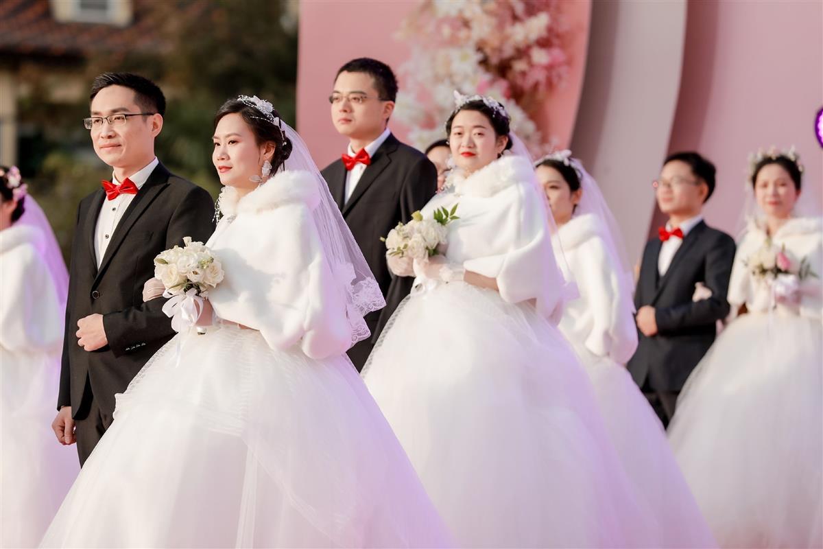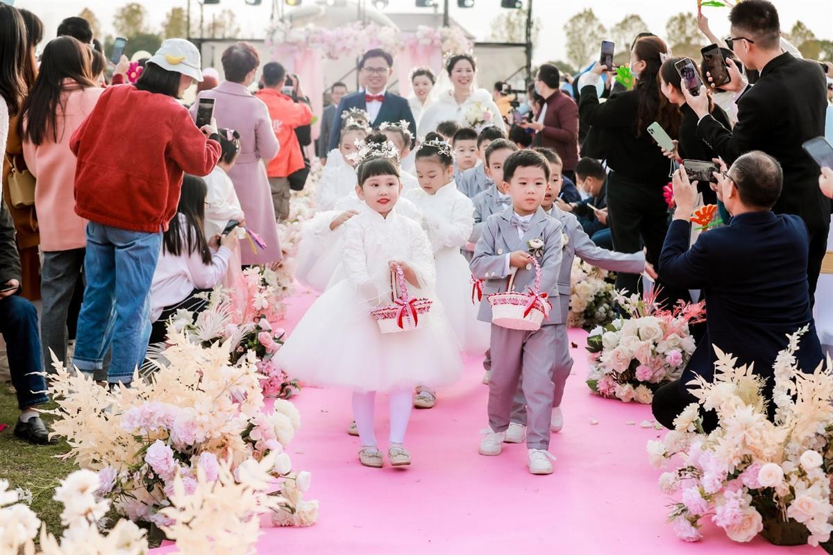 16时16分,随着鸣笛声的响起,30对新人们乘坐“幸福号”列车来到婚礼主会场。在所有来宾及亲朋好友的祝福声中,小花童们带着新人们一同步入神圣的婚礼殿堂。