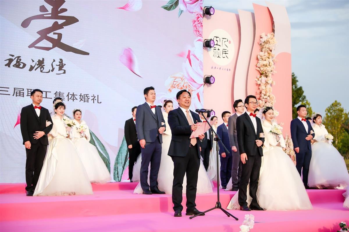 医院党委书记万红慧作为主婚人致词:“四季花海香满园,人民儿女缔良缘。人民喜事年年有,今年婚典更特别。小家、大家、国家,可谓家国同庆,三喜临门!”