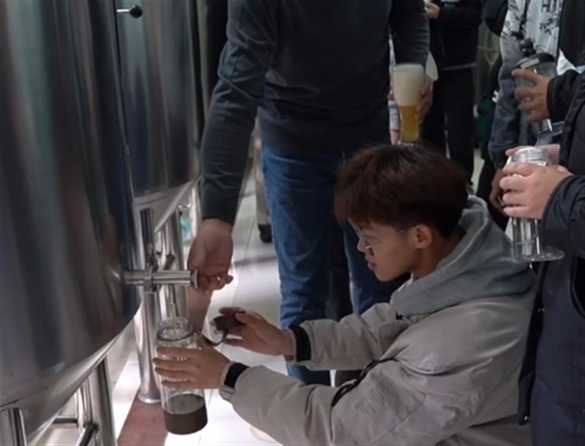 视频显示,在类似工厂的实验室里立着几个近2米高的金属桶,不断有学生或拿着矿泉水瓶或水杯,拧开金属桶底部的阀门灌装啤酒,身旁还有老师讲解。从视频中可以看到,学生们频频举杯,畅饮啤酒。