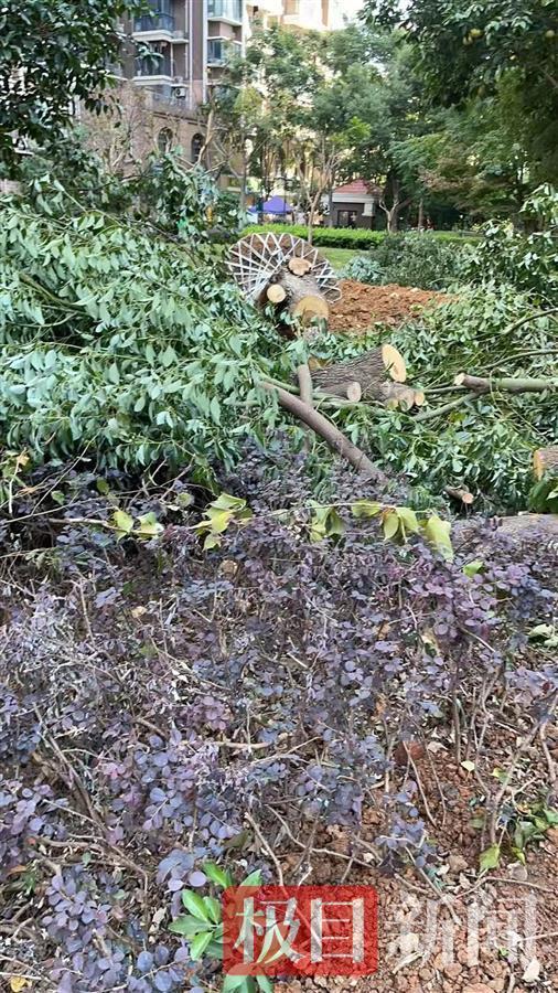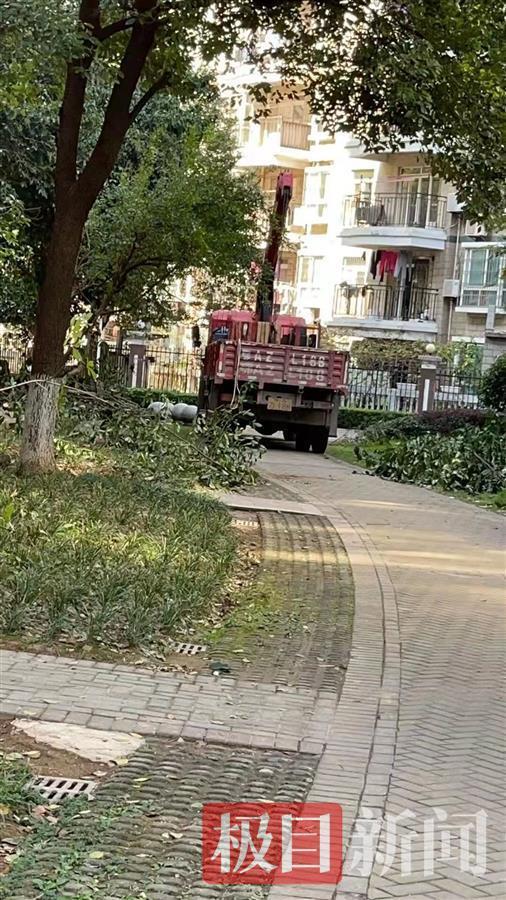极目新闻记者接到反映后赶到该小区,一进小区大门,记者便看见了一群伐木工人正在拖拽一棵棵已经砍倒的大树往卡车上搬运,卡车旁边还停着一辆沾满泥土的吊车。在小区的人行道旁,随处可见散落的泥土、树木残枝和木屑。站在被连根拔起的大树旁,邹先生边叹气边向记者抱怨:“小区内的植被并不多,如果砍掉了这几棵树,整个小区仅存的一点绿化都没有了,让人心疼。”