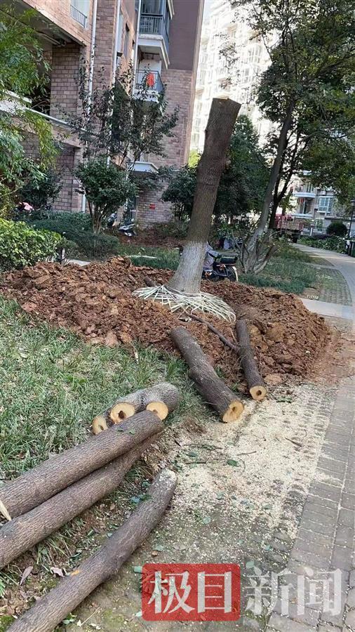 11月14日,热心读者邹先生向极目新闻热线反映:武汉市洪山区幸福佳苑小区,八九棵大树长得好好的,这几天突然被一群人锯掉并且被连根挖起,感到十分可惜。