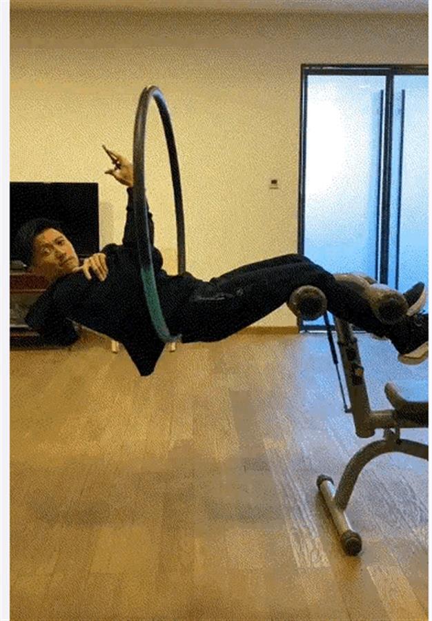 视频中,他用双脚支撑在运动器材上,在上半身保持悬空状态下,用腰部旋转呼啦圈,且还边转边玩手机。在视频配文中,他表示“这是前两天在综艺节目学的一招,你们也试试?”