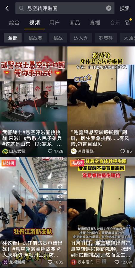 11月14日,极目新闻记者在短视频平台搜索看到,“悬空呼啦圈挑战赛”在网上热度不减,发起人谢霆锋的该条视频点赞量近100万人。
