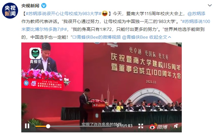 【苏炳添说很开心让母校成为983大学】今天,暨南大学115周年校庆大会上,苏炳添作为教师代表讲话。“我很开心通过努力,让母校成为中国独一无二的‘983大学’。”苏炳添说100米要比博尔特多跑7步,“我的身高只有1米72,只能付出更多的努力”。“世界其他选手能做到的,中国选手也一定能!”