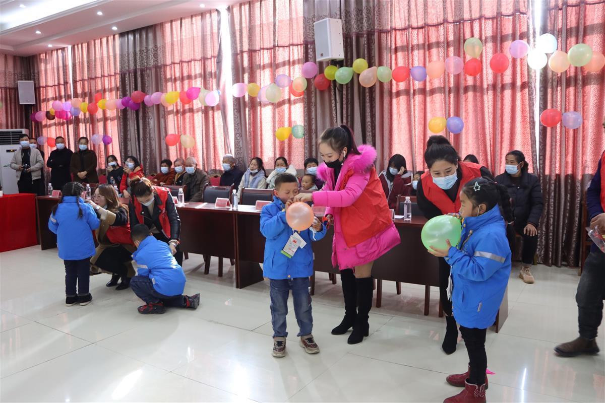 活动现场欢声笑语、暖意融融、气氛热烈!不仅有谭属宝、杨羽婷两名留守儿童代表分别朗诵了写给爸爸妈妈和“爱心妈妈”的信,还有当地热情的志愿者们带领孩子们和“爱心妈妈”们一起跳手指舞、吹气球、做互动游戏、过集体生日,最后“爱心妈妈”代表们将精心准备的羽绒服、运运鞋、书包、画笔、课外书籍等价值近万元的温暖包送给20名留守儿童,并与5名贫困留守儿童建立长期结对关系。