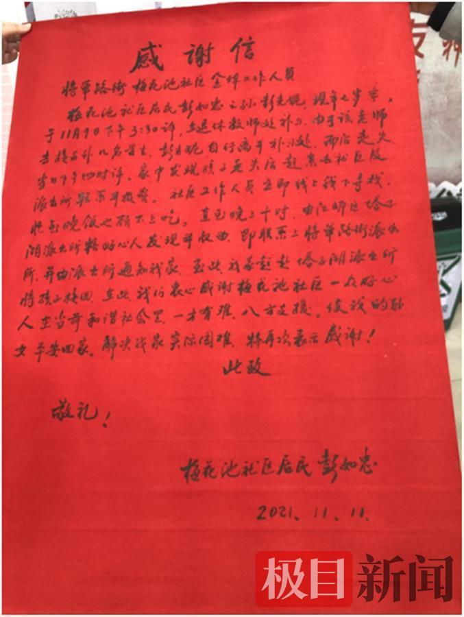 红色的宣纸上,一字一句诉说着感谢,11月11日下午,家住武汉市东西湖区梅花池村的彭如忠爹爹赶到梅花池社区,将这封手写感谢信送到了社区工作人员手中,信中写道,“我们衷心感谢梅花池社区和一众好心人,在当今和谐社会里,一方有难、八方支援,使我的孙女平安回家。”这封感谢信里,有着怎样的故事?