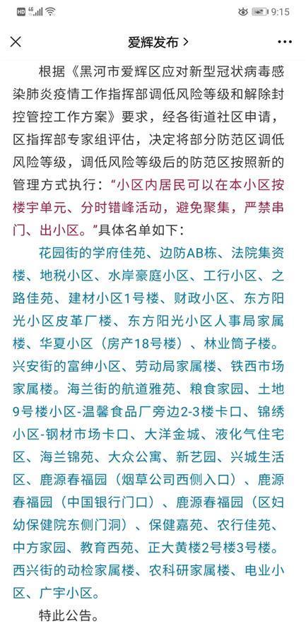 黑河市爱辉区在发布的公告中称,根据《黑河市爱辉区应对新型冠状病毒感染肺炎疫情工作指挥部调低风险等级和解除封控管控工作方案》要求,经各街道社区申请,区指挥部专家组评估,决定将部分防范区调低风险等级,按照新的管理方式执行。