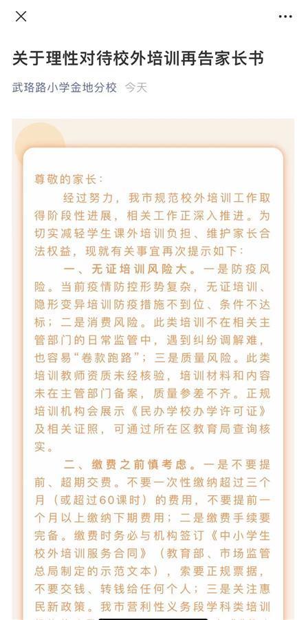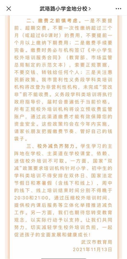 11月13日,武汉市教育局通过各中小学、幼儿园发布《关于理性对待校外培训再告家长书》,提醒家长注意防范校外培训机构相关风险,缴费时需谨慎,呼吁家长转变教育观念,切实减轻学生校外培训负担促进孩子的全面发展和健康成长。