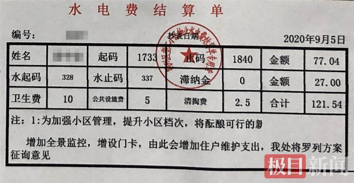 极目新闻记者调查发现,用高价电的除了楚兴小区的130多户居民,还有其对面塑二小区的180多户居民。从塑二小区居民陈女士提供的水电费结算单可以看到,不仅电费高于统一定价,自来水价格也明显高于当地的市场定价。