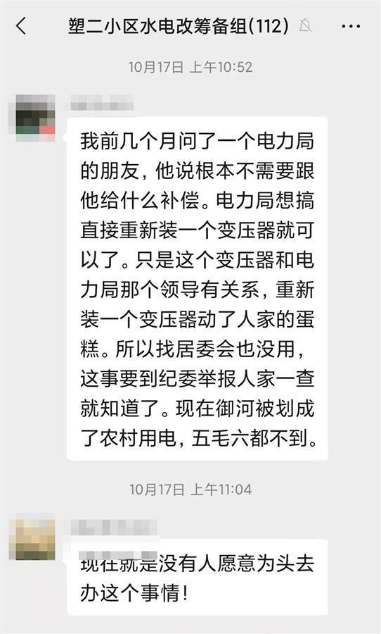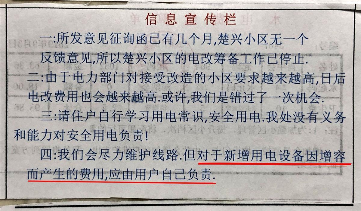“连续三个月不交电费,就会被断电。”近20年来,楚兴、塑二小区的居民反对刘某加价供电的呼声日益高涨,多次向社区反映。阳女士说,社区曾多次组织居民代表、刘某和供电公司等多方进行协调,研究解决小区的电网改造方案,但每一次都无疾而终。