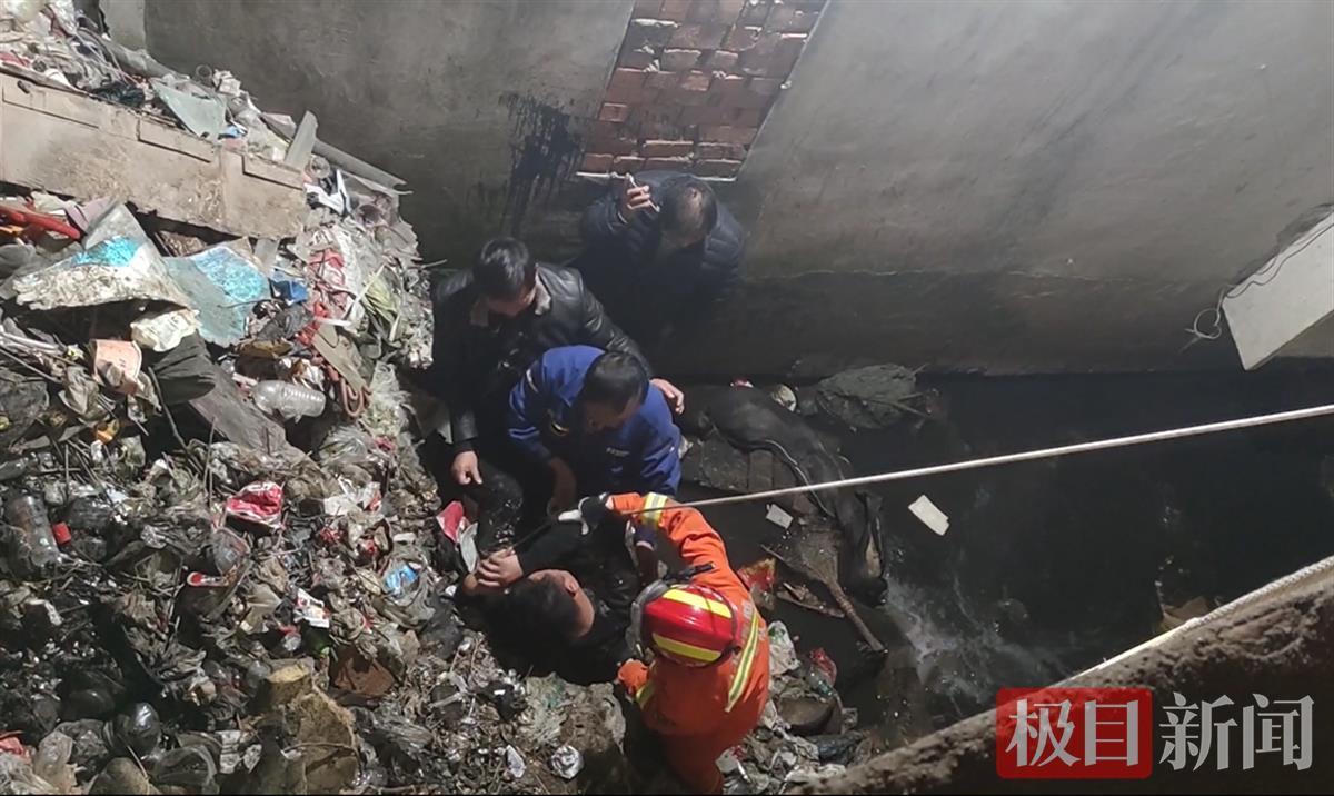 15日晚10时48分,武汉消防接到报警,在黄陂区汉黄路道观泉路路口,有一醉汉失足掉落路旁的臭水沟。汉口北站消防员迅速赶往现场,只见醉汉掉入的臭水沟距路面约3米深,水沟下方情况不明,男子跌落时可能摔伤腰背和手脚,无法爬起,只能仰面躺在沟底。