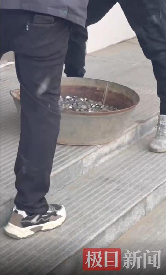 现场视频显示,两名年轻小伙合力搬起满满一铁盆的硬币,费力地向银行走去。极目新闻记者采访获悉,视频拍摄于河南濮阳市清丰农村商业银行马村支行门口,铁盆里的硬币是蒋先生12日结婚当天,朋友们从市区的银行取出的份子钱,总共凑了9999个硬币。