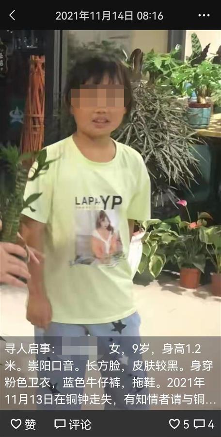 “寻人启事:晨熙,女,9岁,身高1.2米。崇阳口音,长方脸,身穿粉色外衣,蓝色牛仔裤,拖鞋。”11月14日8点16分,崇阳县公安局铜钟派出所所长吴细秀发了一条朋友圈。