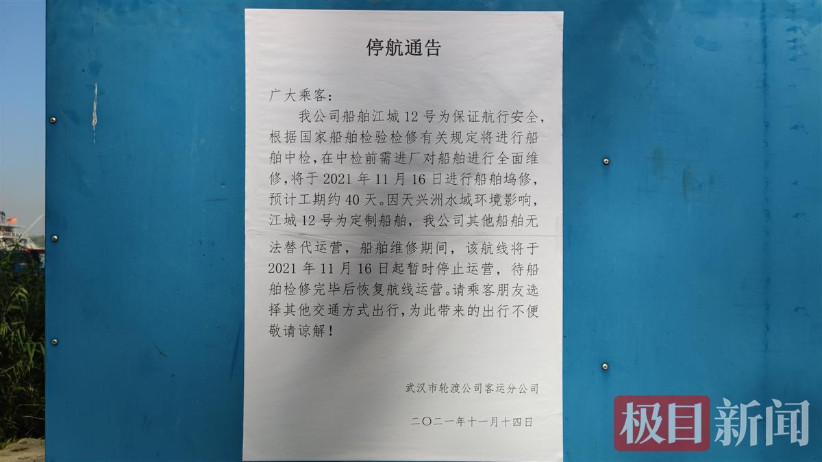 为保障轮渡航行安全,武汉市轮渡公司所属的江城12号轮渡(运营航线为天兴洲一青山)于11月16日起,进行为期近2个月的船舶中检,船检期间天兴洲至青山轮渡航线停止运营。