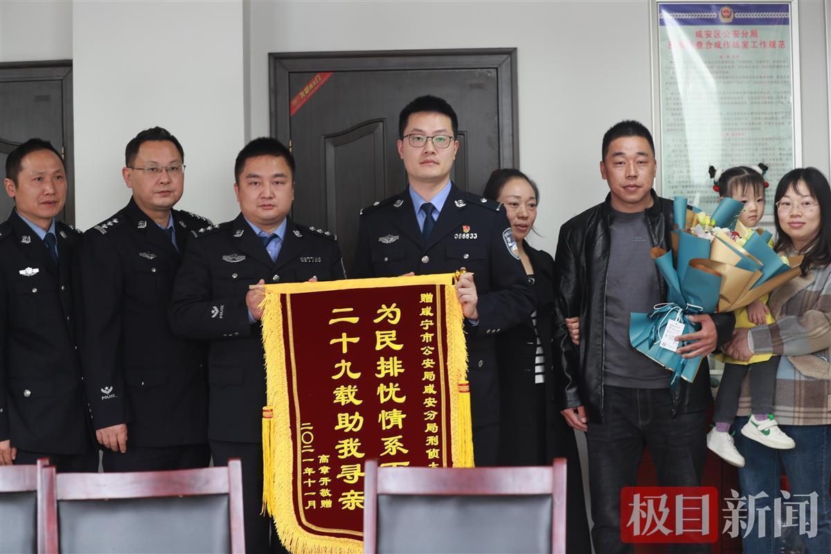 下午3点半,张利宾和民警们首站到达了咸安公安,两个姐姐手捧鲜花站在门口等待着他们的到来。经过简单而温馨的认亲仪式后,张利宾和两个姐姐一起将一面“为民排忧情系百姓 二十九载助我寻亲”的锦旗赠送给了咸安警方。随后,姐弟三人在民警的护送下启程回家,与父母团聚。