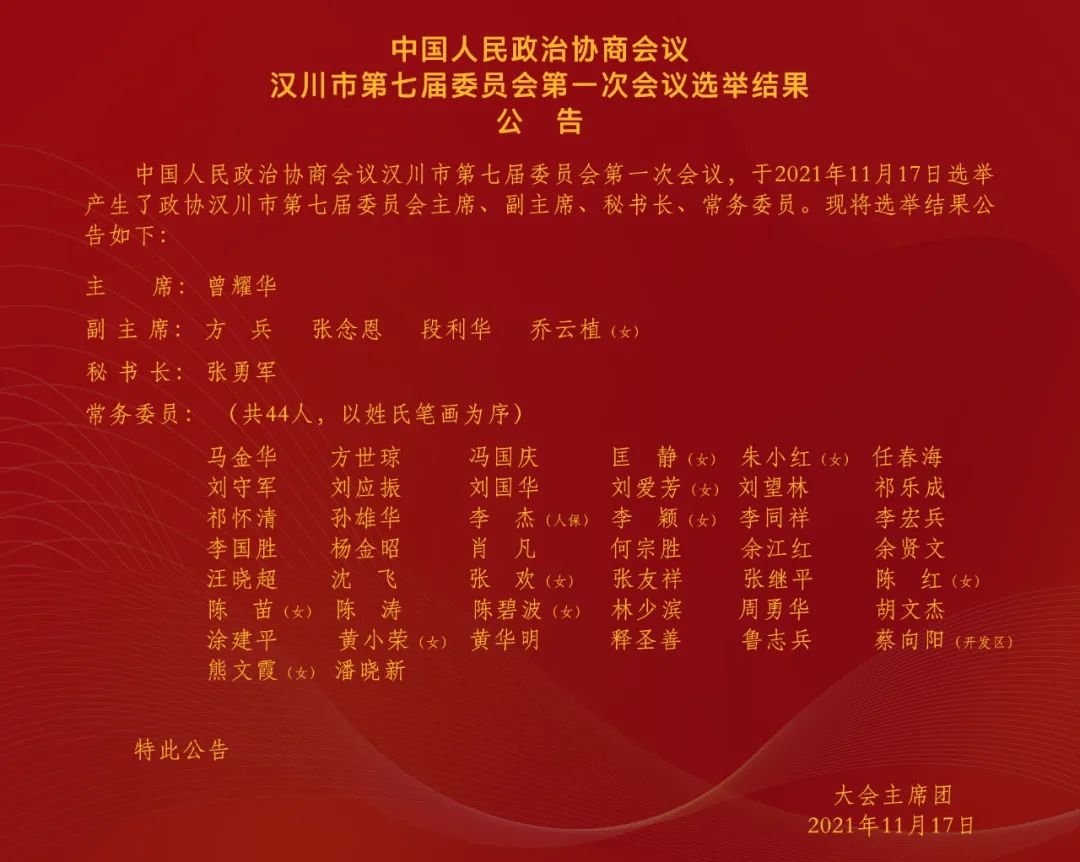 经过全体政协委员共同努力,政协汉川市第七届委员会第一次会议在圆满完成各项议程后,于11月17日下午在市影剧院胜利闭幕。